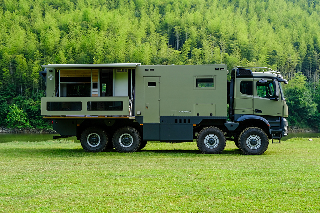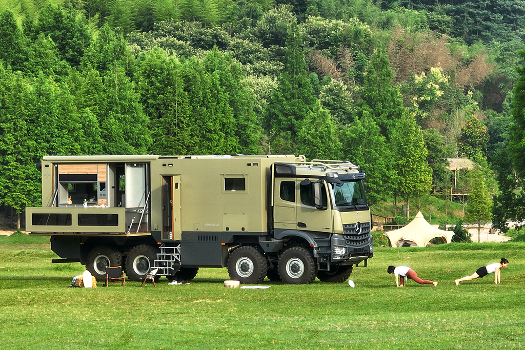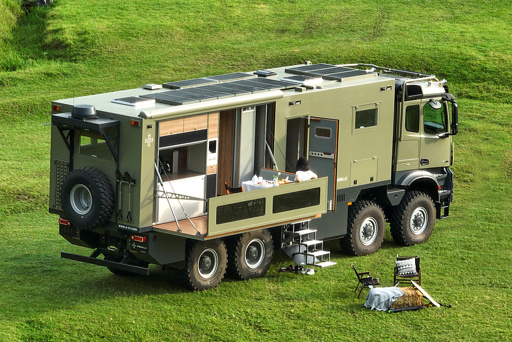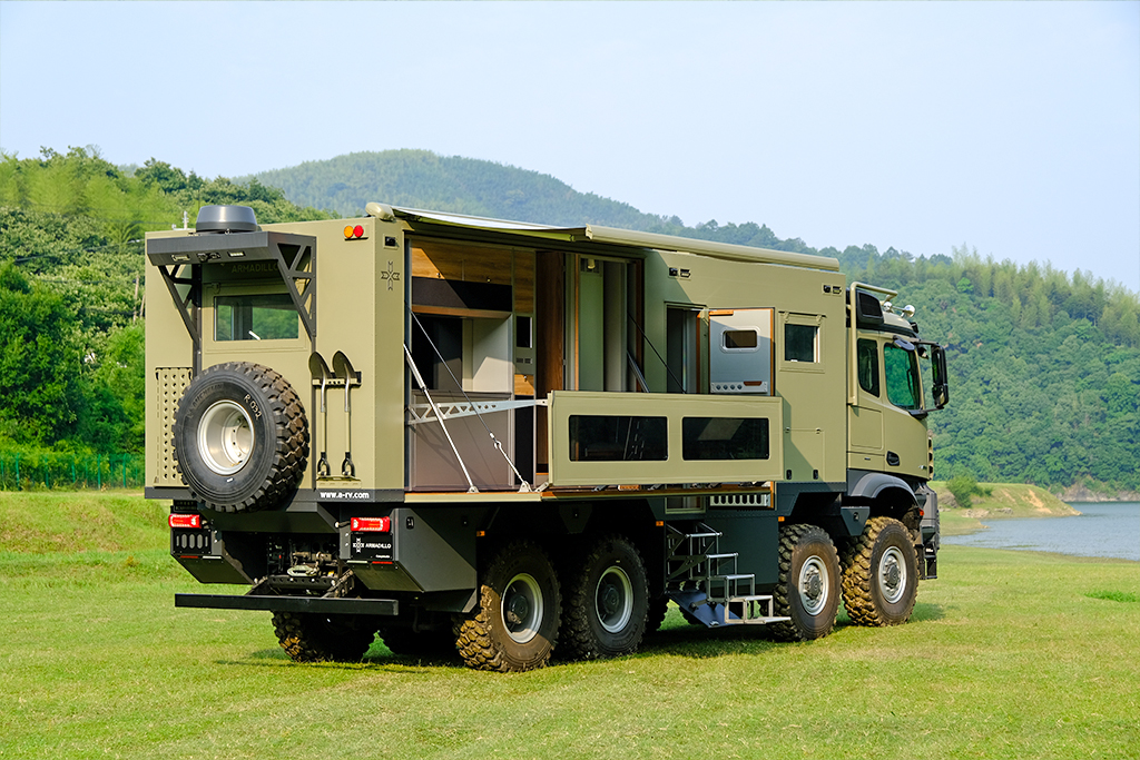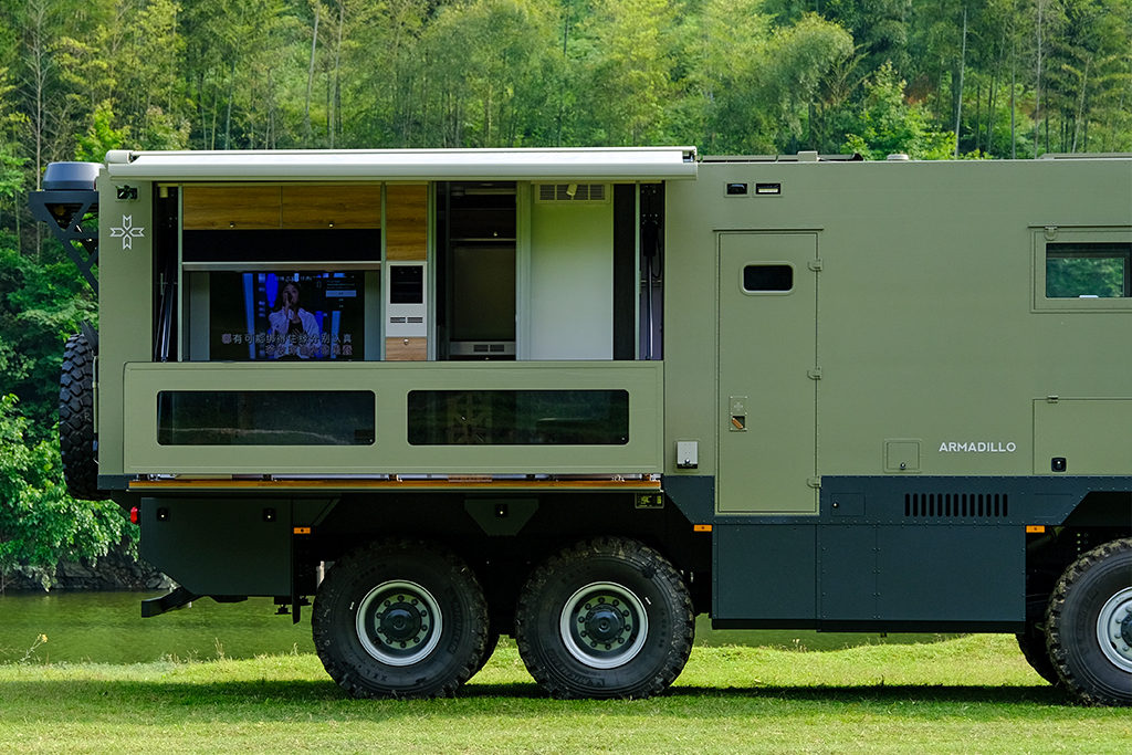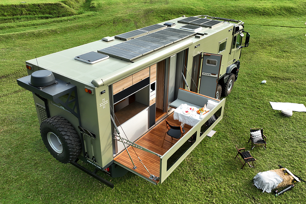 Right rear side: Folding and expanding balcony, equipped with outdoor kitchen, sofa, tea seat, and teak flooring